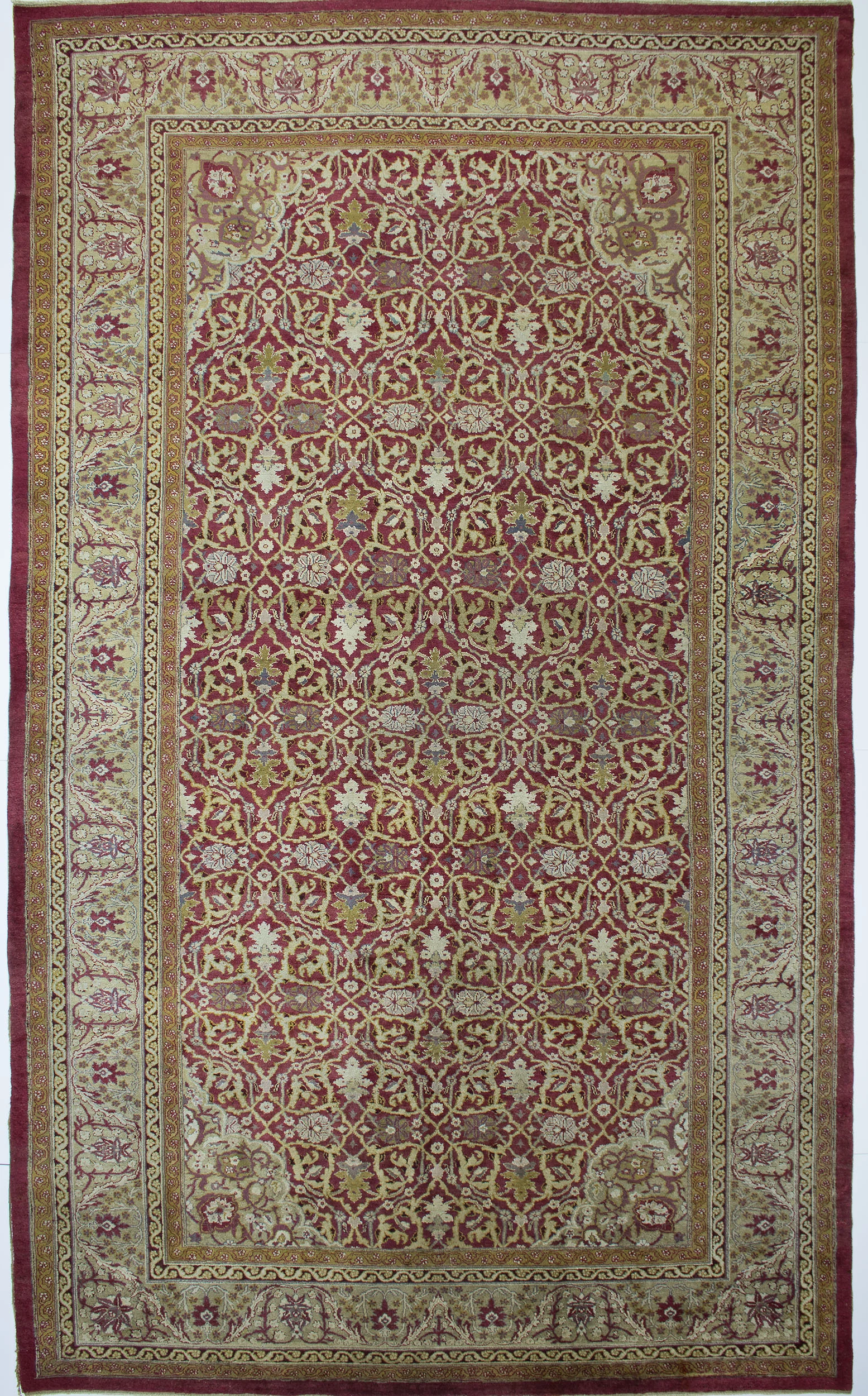 The city of Agra, located in the Uttar Pradesh state in northern India, is universally recognized as the home of the Taj Mahal. Carpet production was introduced to this area on a grand scale under the rule of the Mughal Emperor Akbar the Great in the 16th Century. Up to that point, Indian artisans primarily produced inlaid stonework, jewelry, miniature paintings, and lightweight textiles. Respected Persian weavers, who flourished under the rules of Shah Tahmasp and Shah Abbas of the Safavid Dynasty, were brought into these newly established court workshops to introduce the designs and oversee the weaving of pile carpets. Under British rule in the 19th Century, this industry was revived with the assistance of American entrepreneurs, resulting in the manufacture of larger made to order carpets whose designs were inspired from not only their predecessors, but from those of classical Turkish carpets as well.