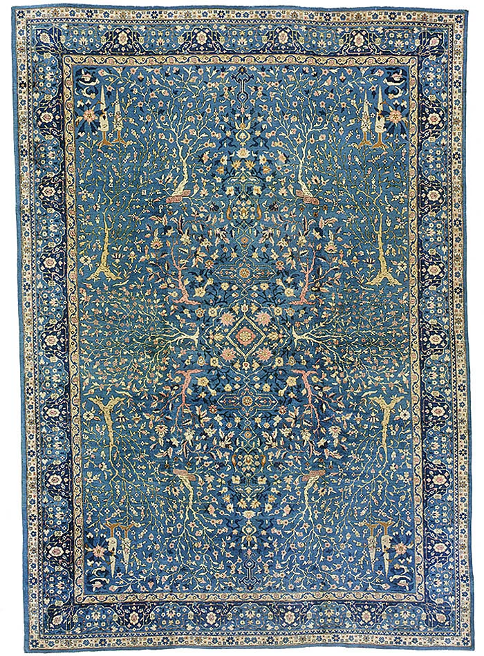 The city of Amritsar, in the Punjab region in northwest India, began producing carpets in the 19th Century when Kashmir was annexed by Maharaja Ranjit Singh. Kashmir was a major weaving center of shawls at the time. The looms established here by both British and American firms utilized the availability of good quality wool from sheep that grazed in the nearby mountains. The designs were primarily inspired by classical Persian, Turkish, and Mughal carpets from the 16th and 17th Centuries. One large sub-group of these carpets, known as Indo-Isfahans, emulated the patterns of Isfahan court carpets by having their overall arrangement of large-scale palmettes interspersed with cloud-band motifs, often executed in softer color palettes than their counterparts. As these carpets were woven for export purposes, it is not uncommon to find them in over-size or palace dimensions.
