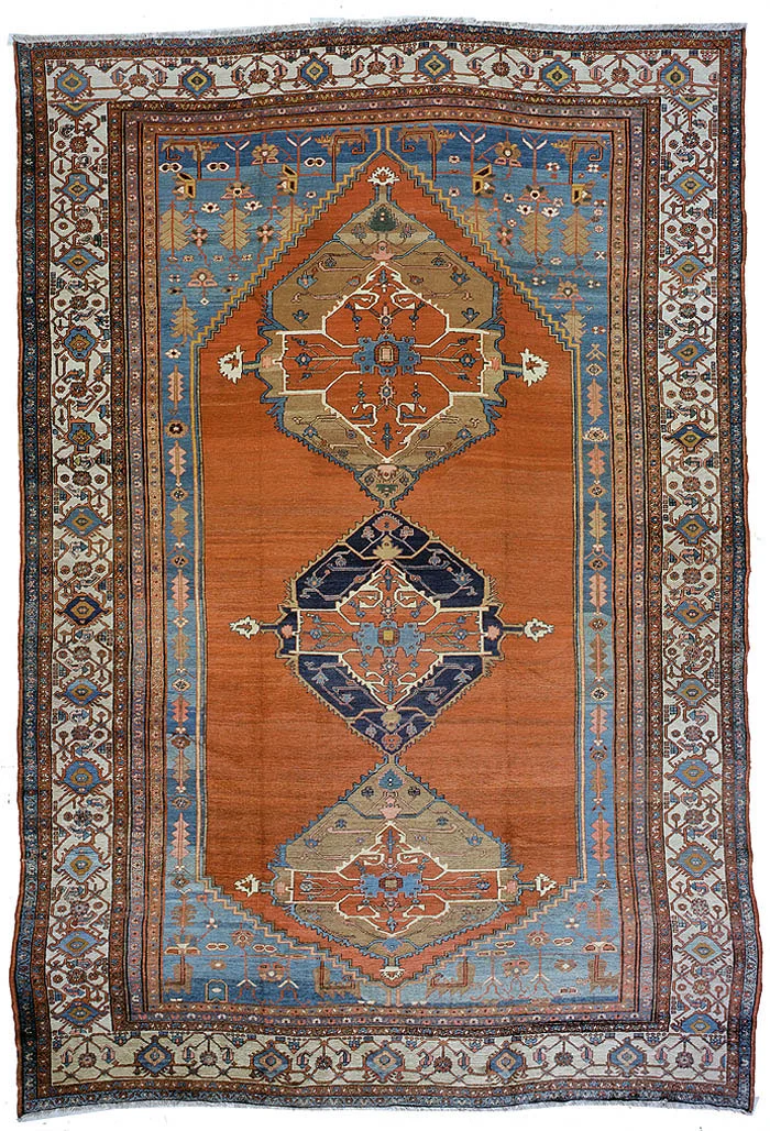 The town of Bakshaish is located in the mountainous Heriz region of Northwest Persia, and is generally accepted to be the oldest weaving village in this district. It is noted for producing carpets that display bold abstract interpretations of the nomadic tribal rugs woven in that country as well as the Caucasus mountains directly to the north. The weavers of this village primarily produced room-size carpets executed with natural dyes that often include soft pleasing tones of madder, sky blue, terracotta, camel, ivory, and saffron. The graphic patterns and designs are often accentuated by their asymmetry as well as their placement on sparsely ornamented fields.