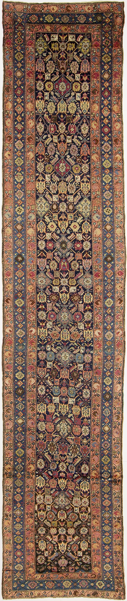 The town of Bakshaish is located in the mountainous Heriz region of Northwest Persia, and is generally accepted to be the oldest weaving village in this district. It is noted for producing carpets that display bold abstract interpretations of the nomadic tribal rugs woven in that country as well as the Caucasus mountains directly to the north. The weavers of this village primarily produced room-size carpets executed with natural dyes that often include soft pleasing tones of madder, sky blue, terracotta, camel, ivory, and saffron. The graphic patterns and designs are often accentuated by their asymmetry as well as their placement on sparsely ornamented fields.