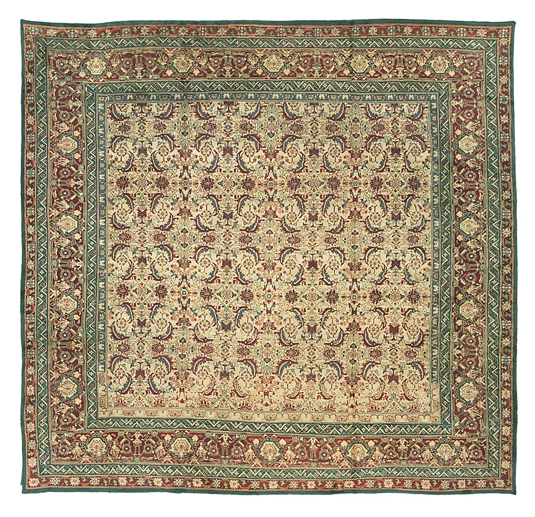 The city of Agra, located in the Uttar Pradesh state in northern India, is universally recognized as the home of the Taj Mahal. Carpet production was introduced to this area on a grand scale under the rule of the Mughal Emperor Akbar the Great in the 16th Century. Up to that point, Indian artisans primarily produced inlaid stonework, jewelry, miniature paintings, and lightweight textiles. Respected Persian weavers, who flourished under the rules of Shah Tahmasp and Shah Abbas of the Safavid Dynasty, were brought into these newly established court workshops to introduce the designs and oversee the weaving of pile carpets. Under British rule in the 19th Century, this industry was revived with the assistance of American entrepreneurs, resulting in the manufacture of larger made to order carpets whose designs were inspired from not only their predecessors, but from those of classical Turkish carpets as well.