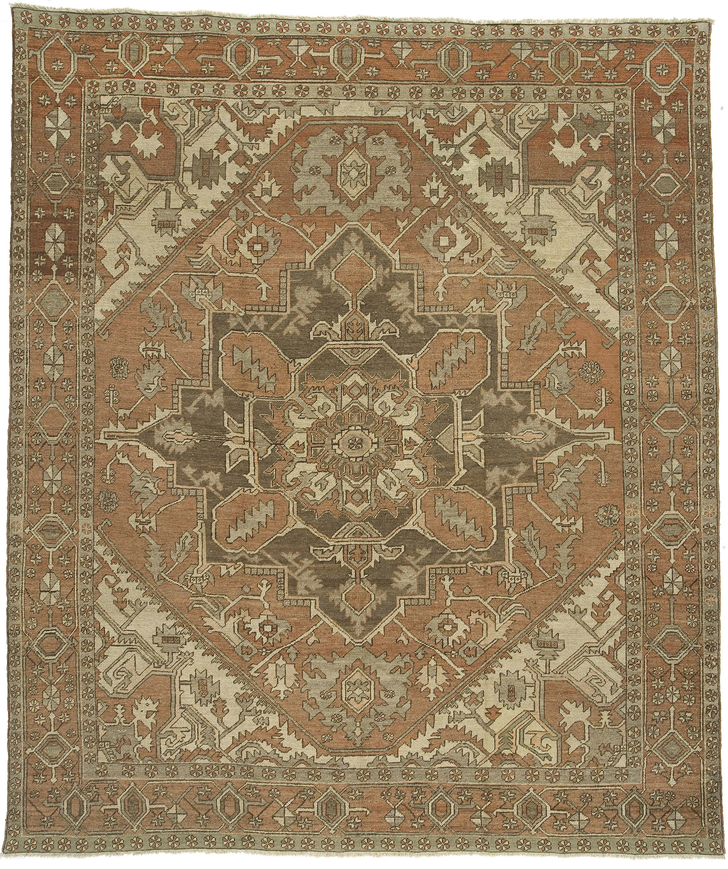 Heriz is a town in northwest Persia (Iran) that has been producing carpets since the 19th century. It is located on Mt. Sabalan, a major source of copper, whose summit is 15,784 feet. The grade of wool used in these carpets is amongst the best, a result of both the high altitude as well as the presence of trace copper in the drinking supply of the local sheep. Carpets from this weaving center are known for having bold geometric interpretations of floral motifs in their patterns. This is attributable to the proximity of the Caucasus, a neighboring mountainous region between the Black and Caspian seas primarily populated by nomads, directly to the north. Heriz carpets are influenced by both the design and coloration of their counterparts from this region. However it needs to be mentioned that Caucasian rugs are seldom found in room sizes, making the Heriz carpets more practical for western rooms and applications. Many examples feature large central geometric medallions flanked by corner spandrels executed in primary colorations. Allover patterns are not as common. Older examples tend to have more dramatic designs utilizing large areas of sparse ornamentation.