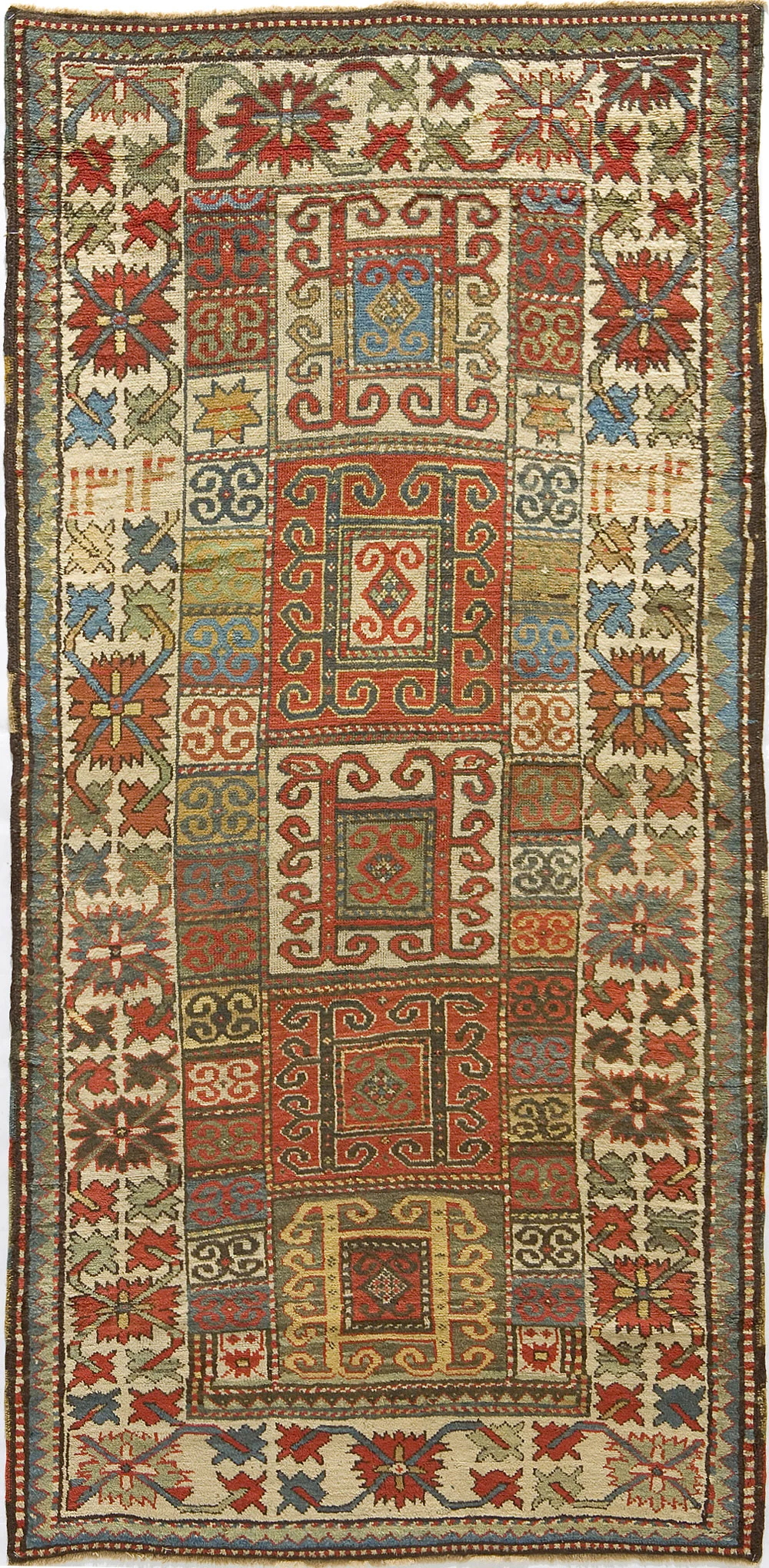 The Caucasus is the geographically-isolated mountainous region north of Persia between the Black and Caspian Seas. The diverse population of this area primarily consists of Armenians and Azeri Turks; however large groups of Georgians and Kurds also inhabit and produce rugs in this territory. The designs illustrated in these weavings are sparsely decorated with large-scale patterns of stylized flora appearing as abstract geometric elements. The impact of these designs is heightened by the usage of a limited number of contrasting primary colors. Kazak rugs are woven in the southern Caucasus in the villages between the towns of Tiflis and Erivan.