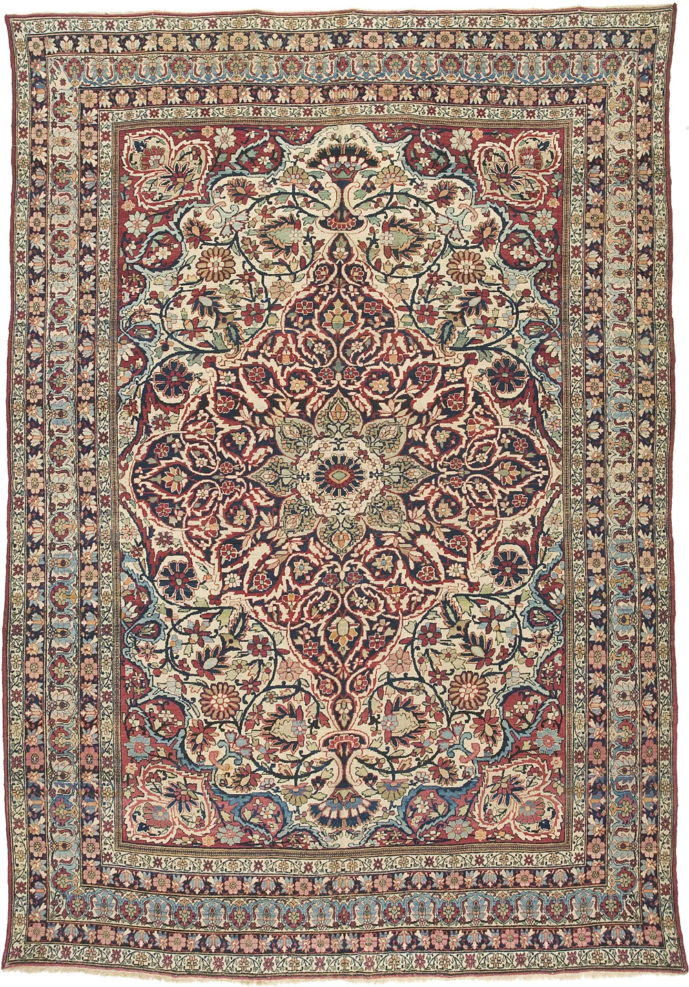 The city and province of Kerman is geographically isolated in the great desert of southern Persia. An industry of both shawl and carpet production has flourished there since the Safavid Dynasty of the sixteenth century. Carpets produced here, once commissioned by the Shahs, came under the control of foreign industry in the early twentieth century. The fine weave of these carpets promotes the utilization of intricate curvilinear floral patterns rendered in a wide range of colors. Distinctive red tones are sourced from cochineal, an insect indigenous to the region that produces magnificent hues of magenta and coral.