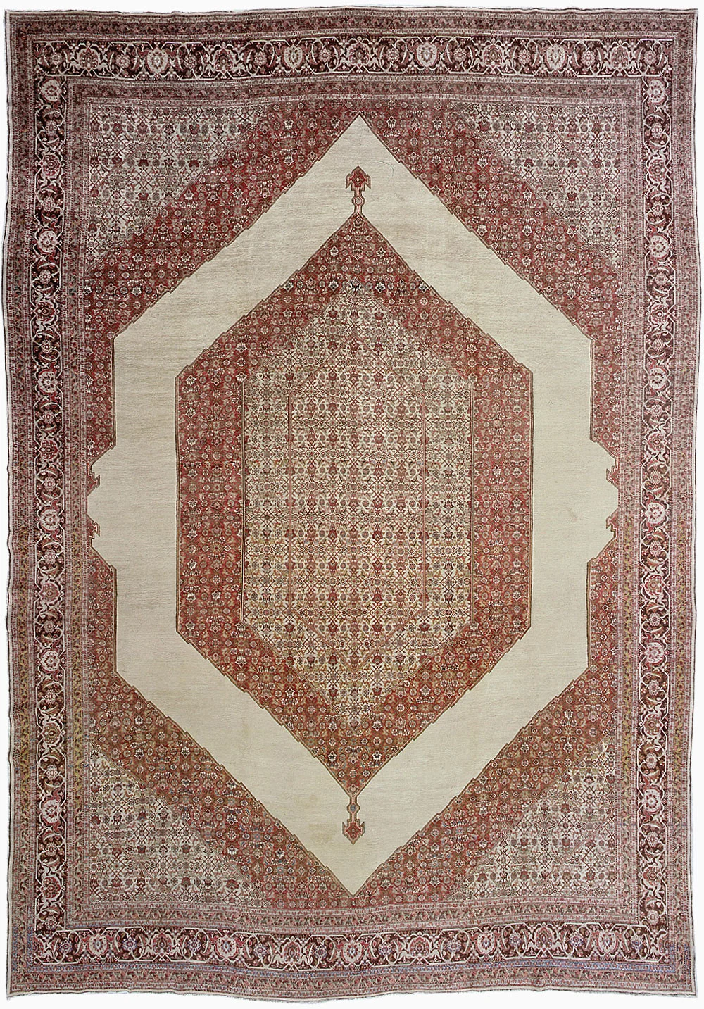 The city of Tabriz in northwest Persia is acknowledged as central to the revival of the carpet industry in the late 19th Century. Merchants from this area were well aware of the demand for Middle Eastern decorative objects from the west, and the location of this city was convenient for exporting items to both Europe and America. The carpet-producing industry here was organized primarily in factories ranging in size from between ten and one hundred looms. The quality of these carpets is considered to be among the best, with the usage of wool indigenous to this high-altitude region, woven in symmetrical knots on a cotton foundation. Some examples can have weaves finer than 400 knots per square inch. The designs of these carpets are both accomplished and eclectic, as traditional patterns from other weaving regions are often utilized and presented in refined manners with pleasing color palettes.