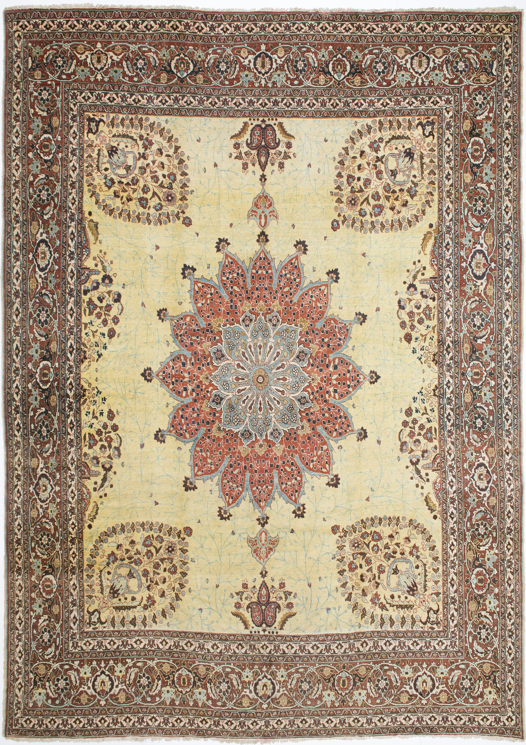 The city of Tabriz in northwest Persia is acknowledged as central to the revival of the carpet industry in the late 19th Century. Merchants from this area were well aware of the demand for Middle Eastern decorative objects from the west, and the location of this city was convenient for exporting items to both Europe and America. The carpet-producing industry here was organized primarily in factories ranging in size from between ten and one hundred looms. The quality of these carpets is considered to be among the best, with the usage of wool indigenous to this high-altitude region, woven in symmetrical knots on a cotton foundation. Some examples can have weaves finer than 400 knots per square inch. The designs of these carpets are both accomplished and eclectic, as traditional patterns from other weaving regions are often utilized and presented in refined manners with pleasing color palettes.