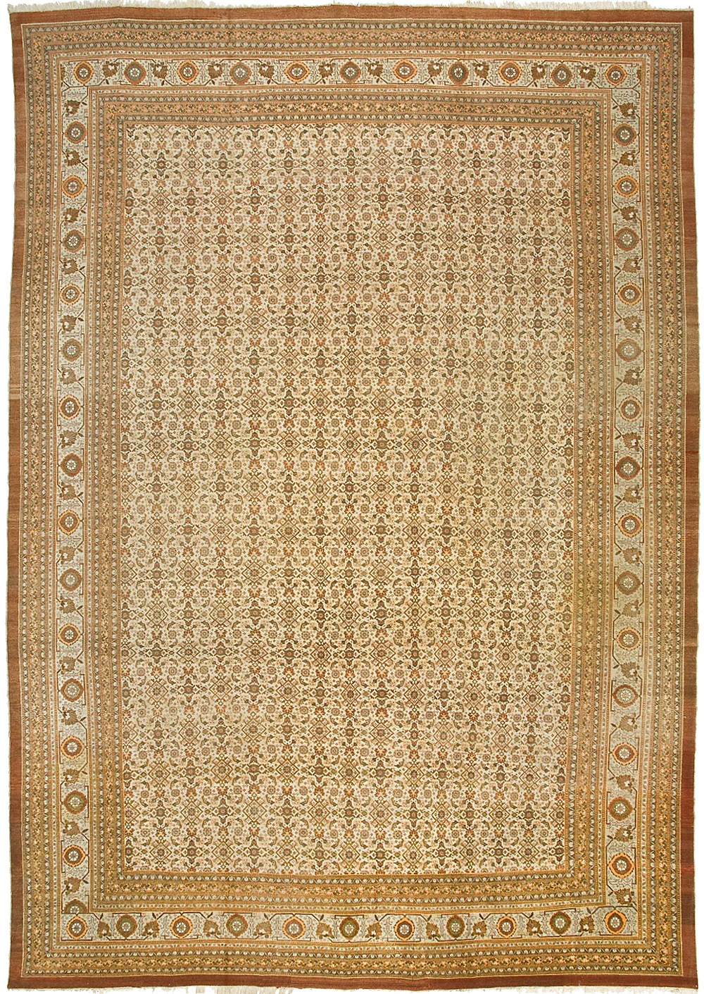 The city of Tabriz in northwest Persia is acknowledged as central to the revival of the carpet industry in the late 19th Century. Merchants from this area were well aware of the demand for Middle Eastern decorative objects from the west, and the location of this city was convenient for exporting items to both Europe and America. The carpet-producing industry here was organized primarily in factories ranging in size from between ten and one hundred looms. The quality of these carpets is considered to be among the best, with the usage of wool indigenous to this high-altitude region, woven in symmetrical knots on a cotton foundation. Some examples can have weaves finer than 400 knots per square inch. The designs of these carpets are both accomplished and eclectic, as traditional patterns from other weaving regions are often utilized and presented in refined manners with pleasing color palettes.