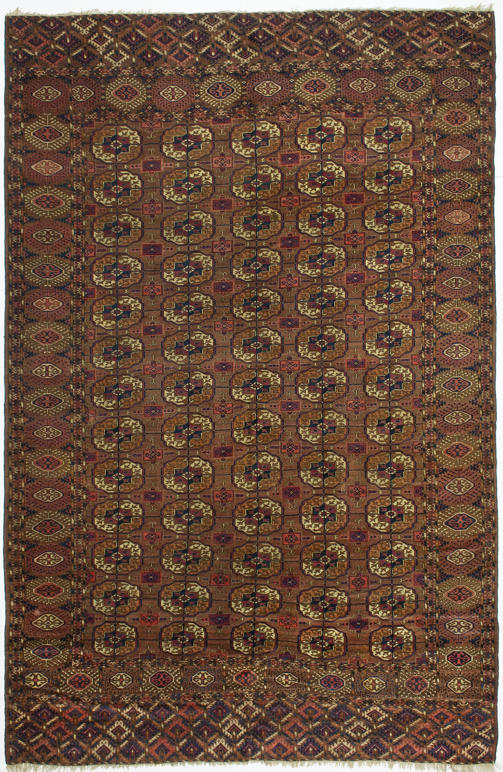 Description: Turkoman rugs and carpets are woven in the region east of the Caspian Sea known as West Turkestan, populated by nomadic tribes. The design element that distinguishes this type of rug is the gul medallion, which is usually octagonal in shape, and includes smaller geometric elements inside. These medallions are used as field decorations often arranged in parallel or offset columns. Each tribe had their own distinctive tribal emblem or gul. This late 19th century example is a product of the Tekke, the largest tribe in the region.
